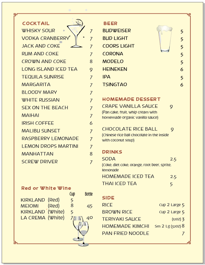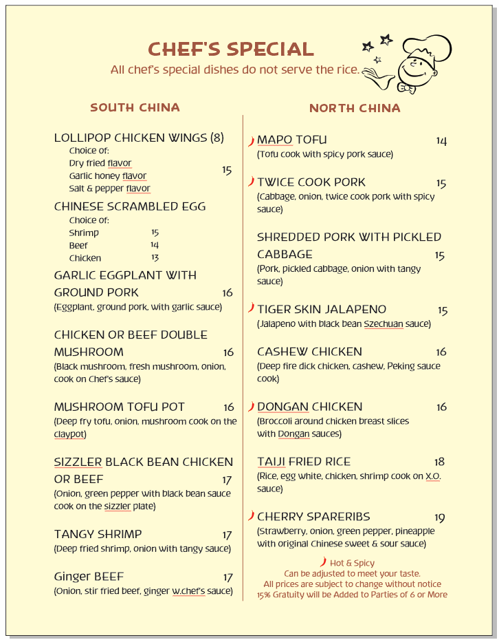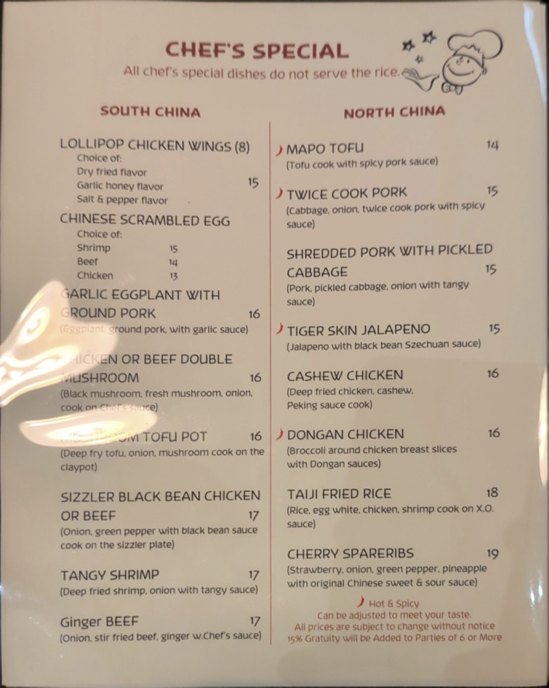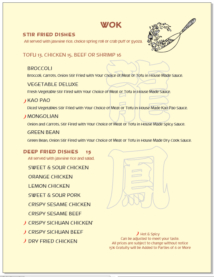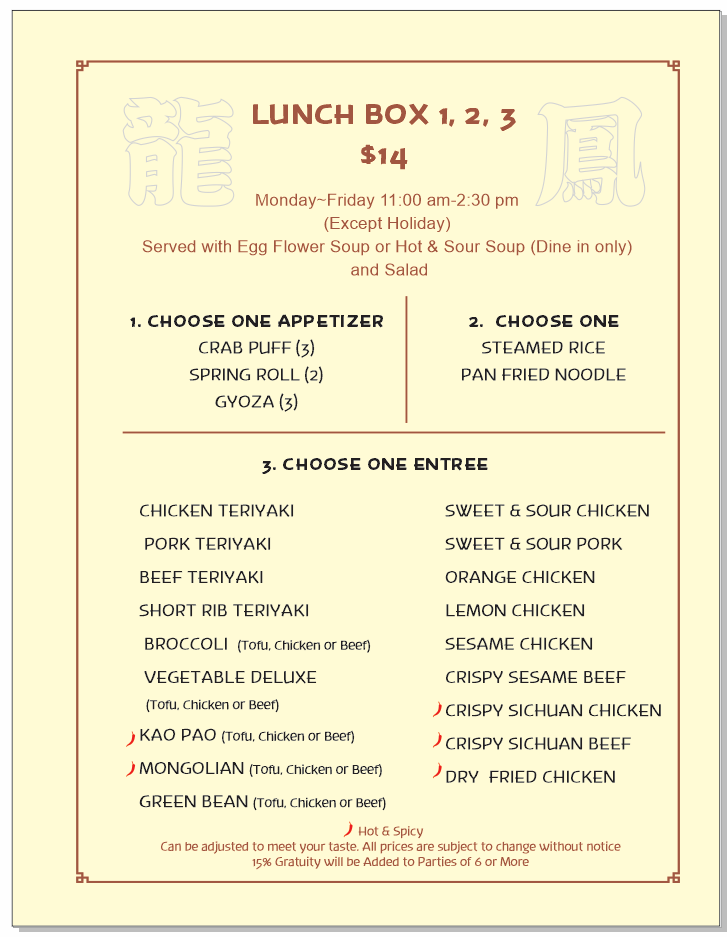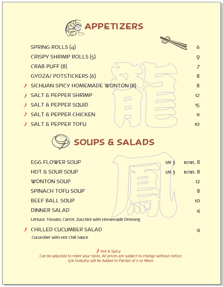 The menu features an array of enticing appetizers like the savory Spring Rolls and the spicy Sichuan Homemade Wontons, perfectly setting the tone for the meal. For lunch, enjoy a variety of flavorful options, including Pork Teriyaki and Crispy Sichuan Chicken, each priced reasonably at just $15.