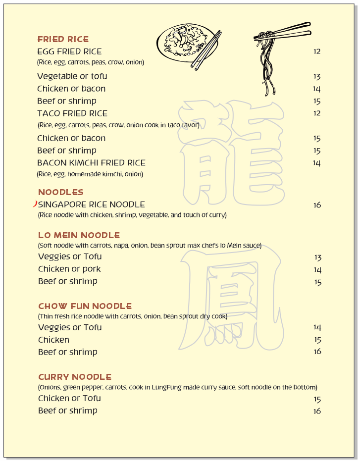 Customer reviews highlight the exceptional food quality and attentive service, with dishes like Salt & Pepper Tofu and Sesame Chicken often mentioned as standouts. The inviting atmosphere and commitment to excellence make Lungfung Wok N Grill a must-visit for anyone seeking delicious and thoughtfully prepared dishes.